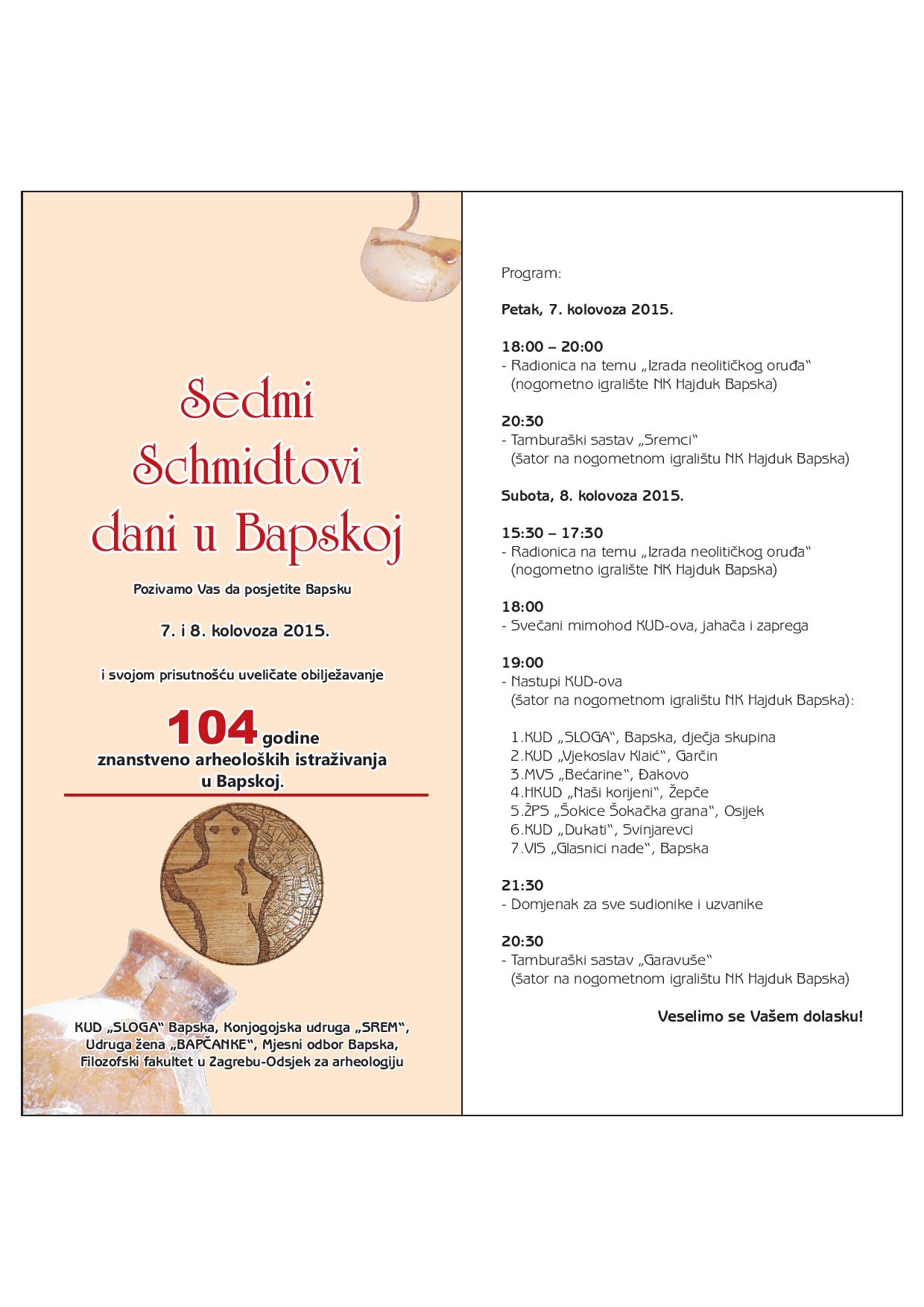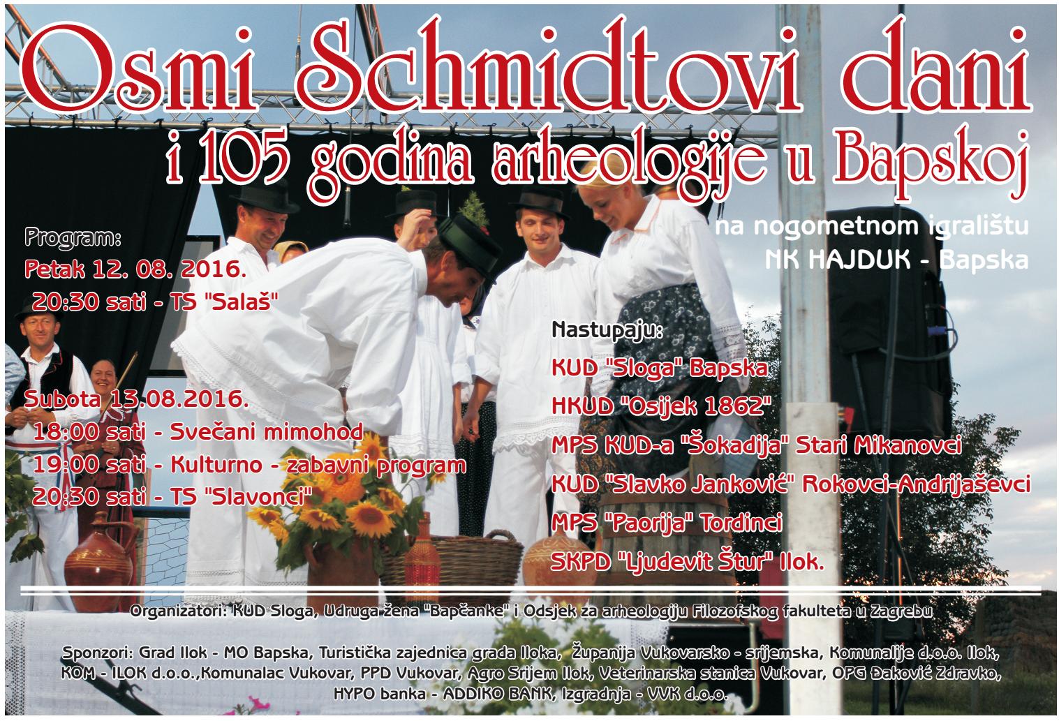 10. i 11.08.2018. - Schmidtovi dani - kulturno-tradicijska ali i zabavna manifestaciju sa poveznicom na arheologiju u Bapskoj kojoj je cilj obilježavati dugu tradiciju arheoloških istraživanja prapovijesnog lokaliteta «Gradac» (mlađe kameno doba) te je povezati sa iznimnim etnografskim naslijeđem Bapske i na taj način bolje valorizirati vrijednost arheološkog lokaliteta kao i ukupnu tradiciju sela.