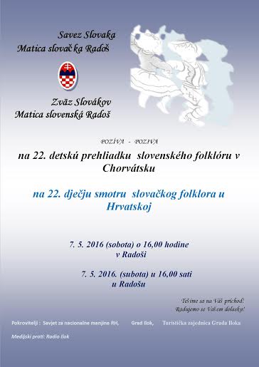 Po prvi puta u najistočnijem prigradskom naselju Hrvatske u Iloku - Radoš održat će se velika folklorna manifestacija u organizaciji Matice Slovačke Radoš. Riječ je o 22. Smotri Dječjeg slovačkog folklora u Hrvatskoj. Očekuje se veliki broj društava i sudionika, te Vas pozivamo da 07.05.2016. posjetite smotru, uživate u programu i budete dio jedinstvenog iskustva.