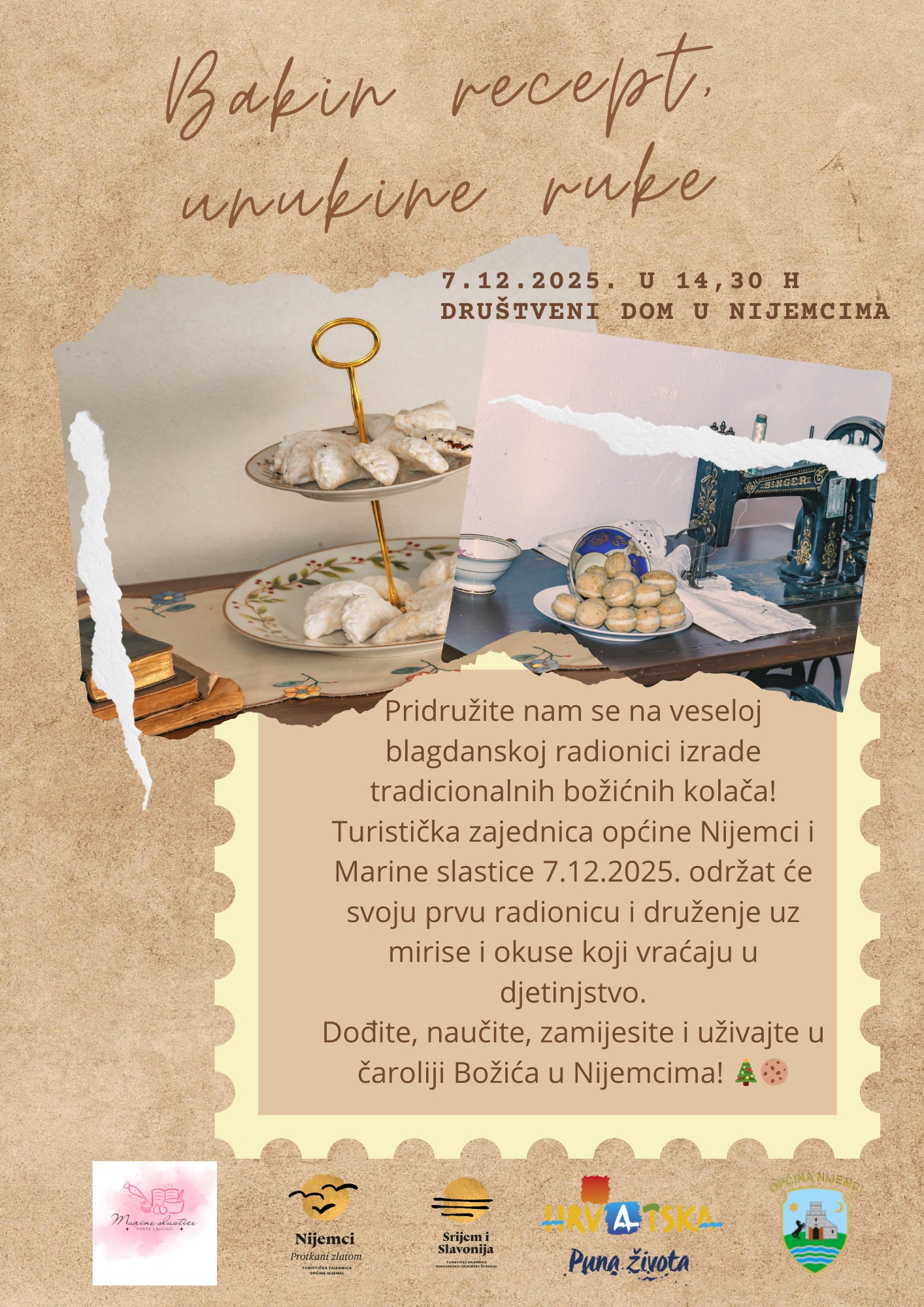 Pozivamo Vas na blagdansku radionicu "Bakin recept, unukine ruke", koja će se održati 7. prosinca 2025. u 14:30 sati u Društvenom domu u Nijemcima.