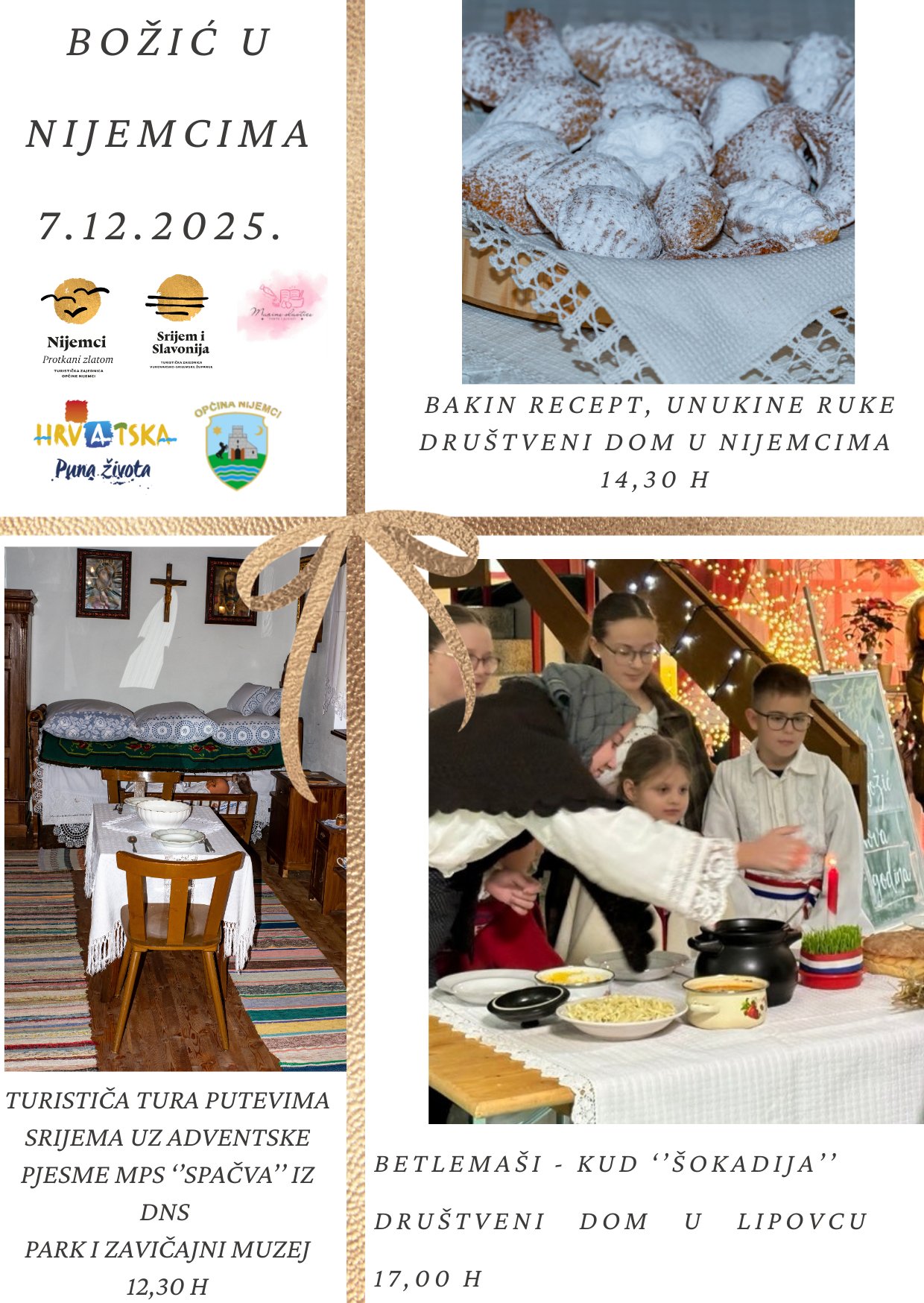 - 14:30 h – Nastavljamo u ugodnoj atmosferi Društvenog doma u Nijemcima na radionici Bakin recept, unukine ruke. Mirisi tradicijskih božićnih kolača, smijeh i zajedničko stvaranje — savršena formula za blagdansko raspoloženje.