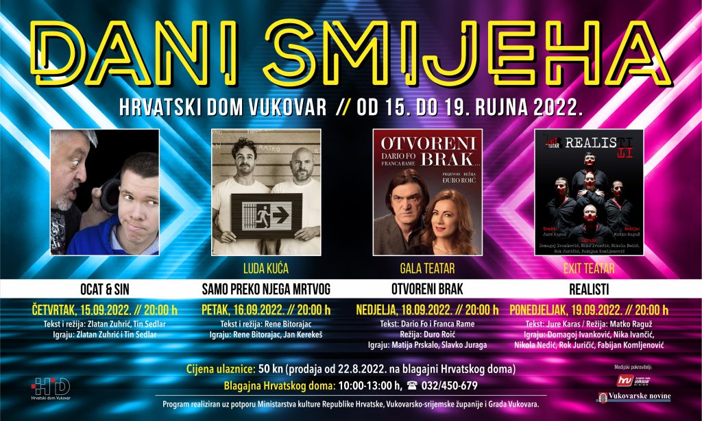 Dani smijeha 2022. održat će se u Hrvatskom domu Vukovar od 15. do 19. rujna. Sve izvedbe počinju u 20 sati. Ulaznice po cijeni 50 kuna za jednu predstavu prodaju se na blagajni Hrvatskog doma od 22. kolovoza. Blagajna je otvorena od ponedjeljka do petka 10-13 sati i dva sata prije predstave. Informacije i rezervacije u isto vrijeme na tel. blagajne 450-679.