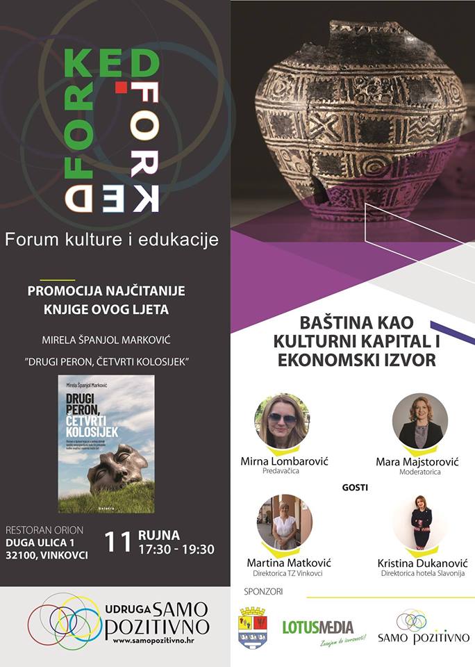 Forum kulture i edukacije u organizaciji udruge "Samopozitivno" na temu "Baština kao kulturni kapital i ekonomski izvor" će se održati 11. rujna s početko u 17.30 u Kavani & restoranu Orion. Uz vrlo interesantne gošće moći ćete čuti predavanje Mirne Levaković Lombarović i razgovorati s njom na temu isplativosti ulaganja u kulturnu baštinu i njezinu zaštitu kao važan čimbenik za prepoznavanje, definiranje i afirmaciju kulturnog identiteta naroda.