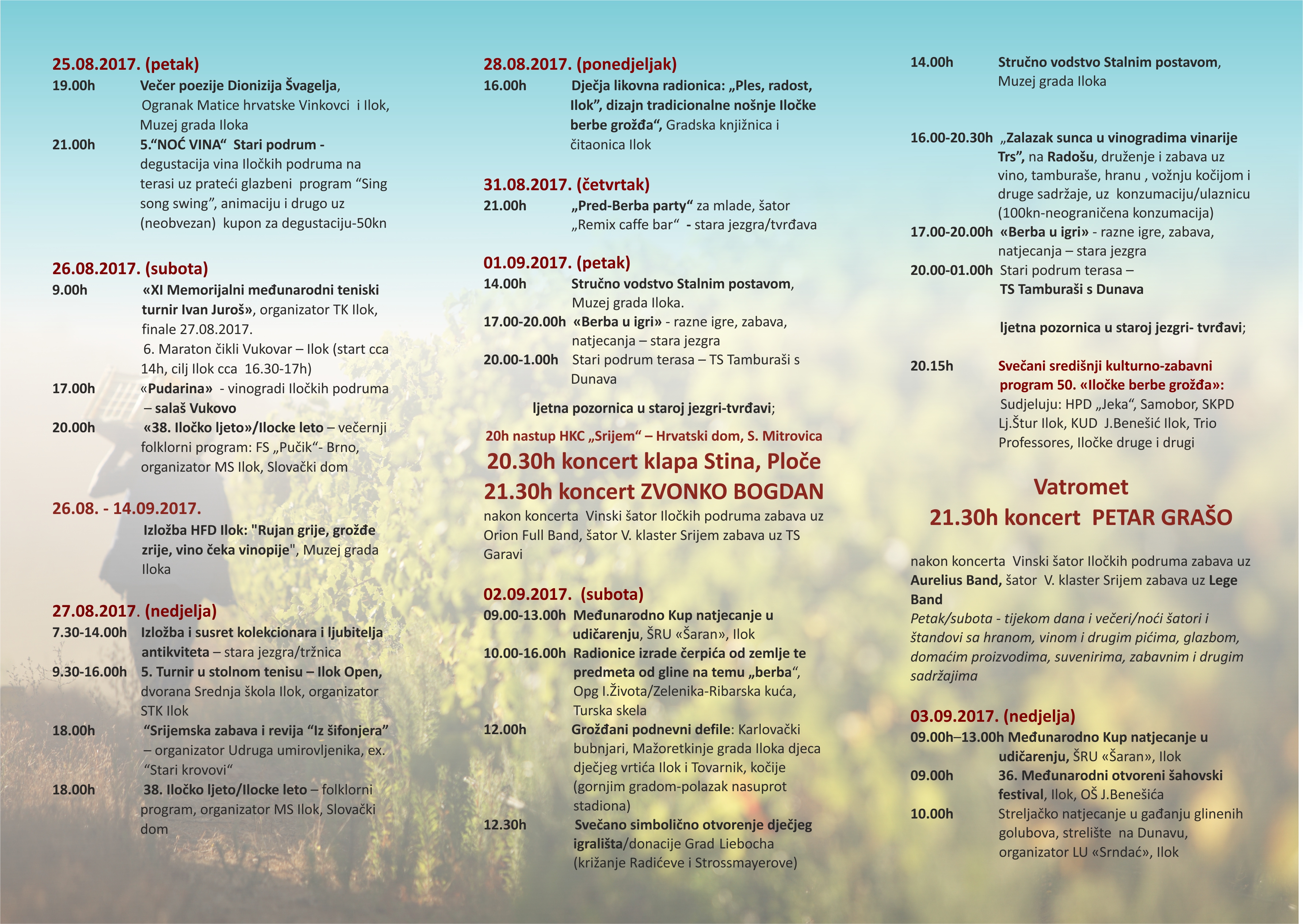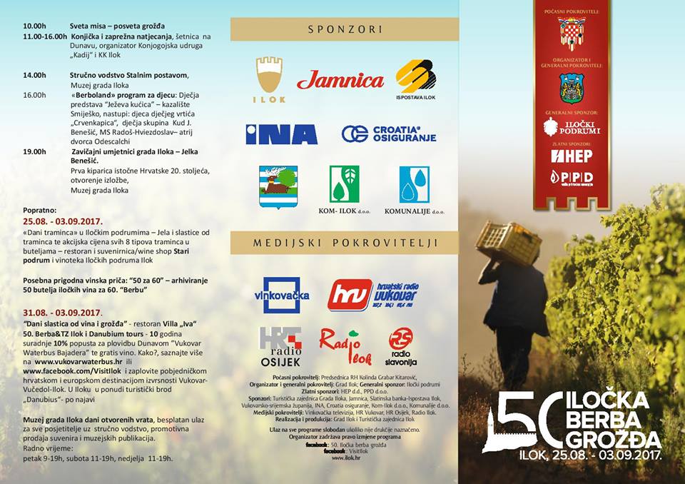 50. Iločka Berba održat će se pof Visokim počasnim pokroviteljstvom predsjednice RH Kolinde Grabar Kitarović od 25.08. do 03.09.2017., središnji vikend 01.-03.09.2017.