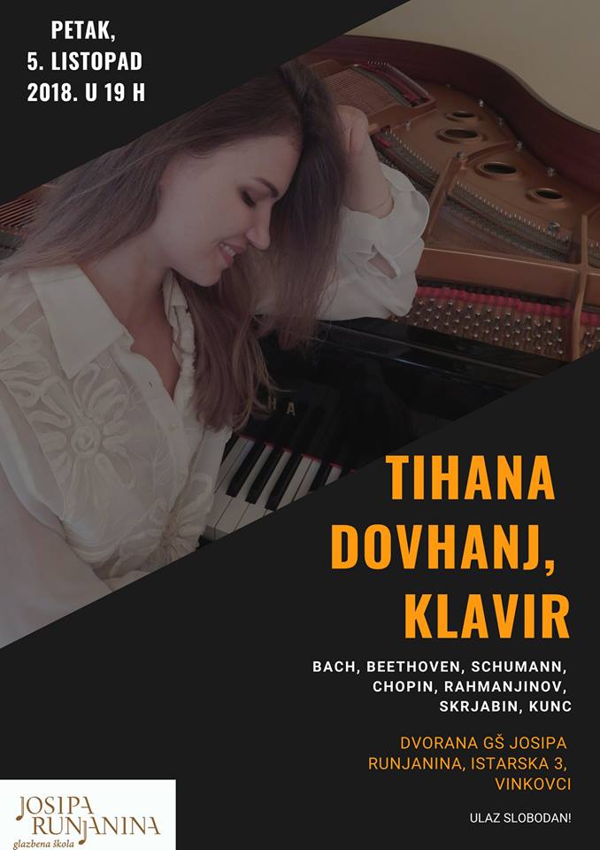 Glazbena škola Josipa Runjanina Vas poziva na glazbeni recital Tihane Dovhanj koji će se održati 5. listopada 2018. s početkom u 19 sati. Ulaz je slobodan.