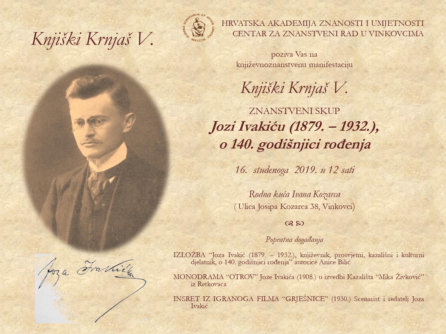 Hrvatska akademija znanosti i umjetnosti - Centar za znanstveni rad u Vinkovcima Vas poziva na književno-znanstvenu manifestaciju Knjiški Krnjaš V. - znanstveni skup Jozi Ivakiću o 140. godišnjici rođenja. Manifestacija se održava 16. studenog 2019. u 12 sati u Rodnoj kući Ivana Kozarca.