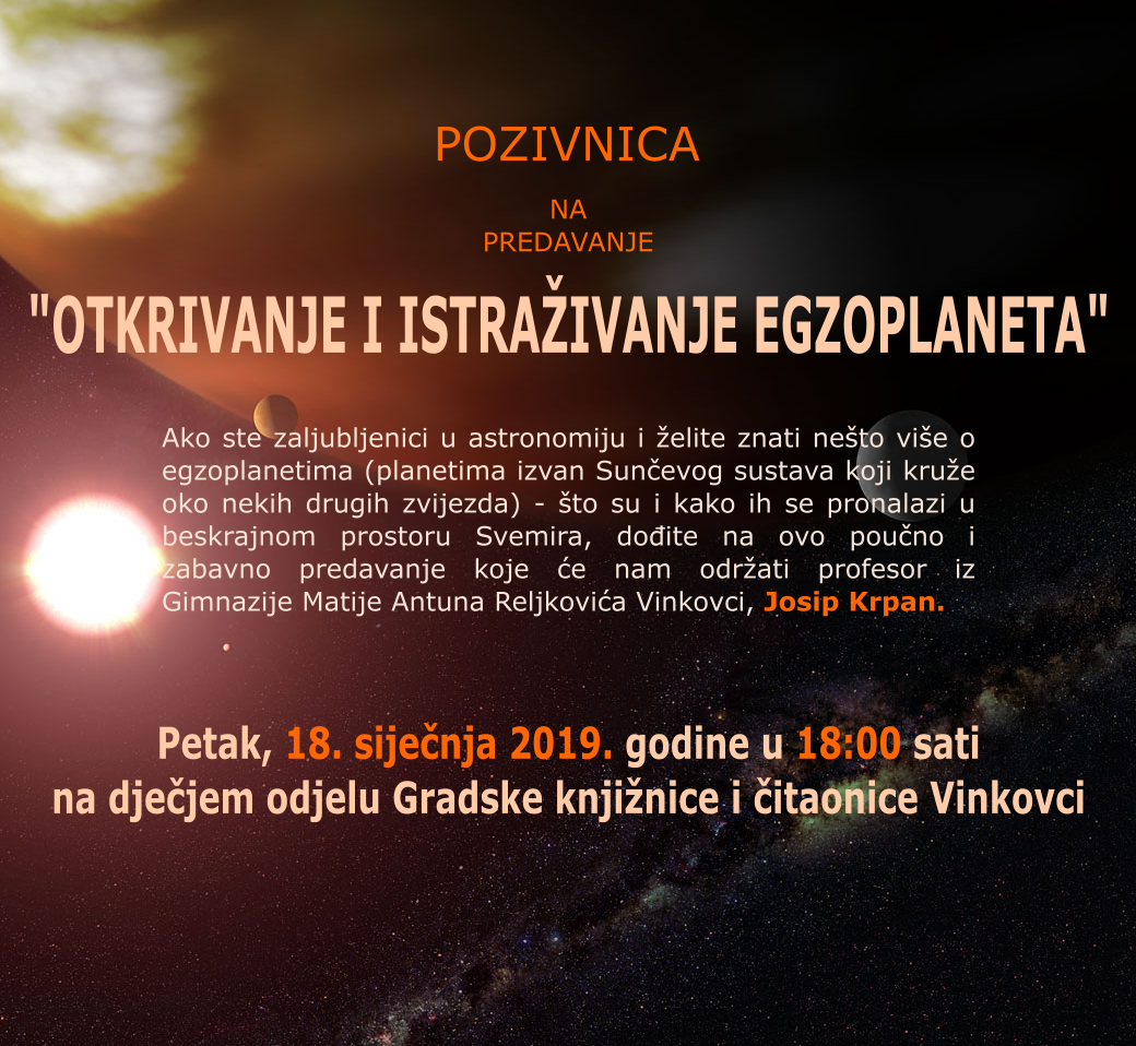 Gradska knjižnica i čitaonica Vinkovci poziva se zaljubljenike u astronomiju na predavanje gimnazijskog profesora Josipa Krpana - "Otrkivanje i istraživanje egzoplaneta" koje će se održati u petak, 18. siječnja u 18:00 sati u gradskoj knjižnici. Pozivnicu možete pogledati u nastavku.