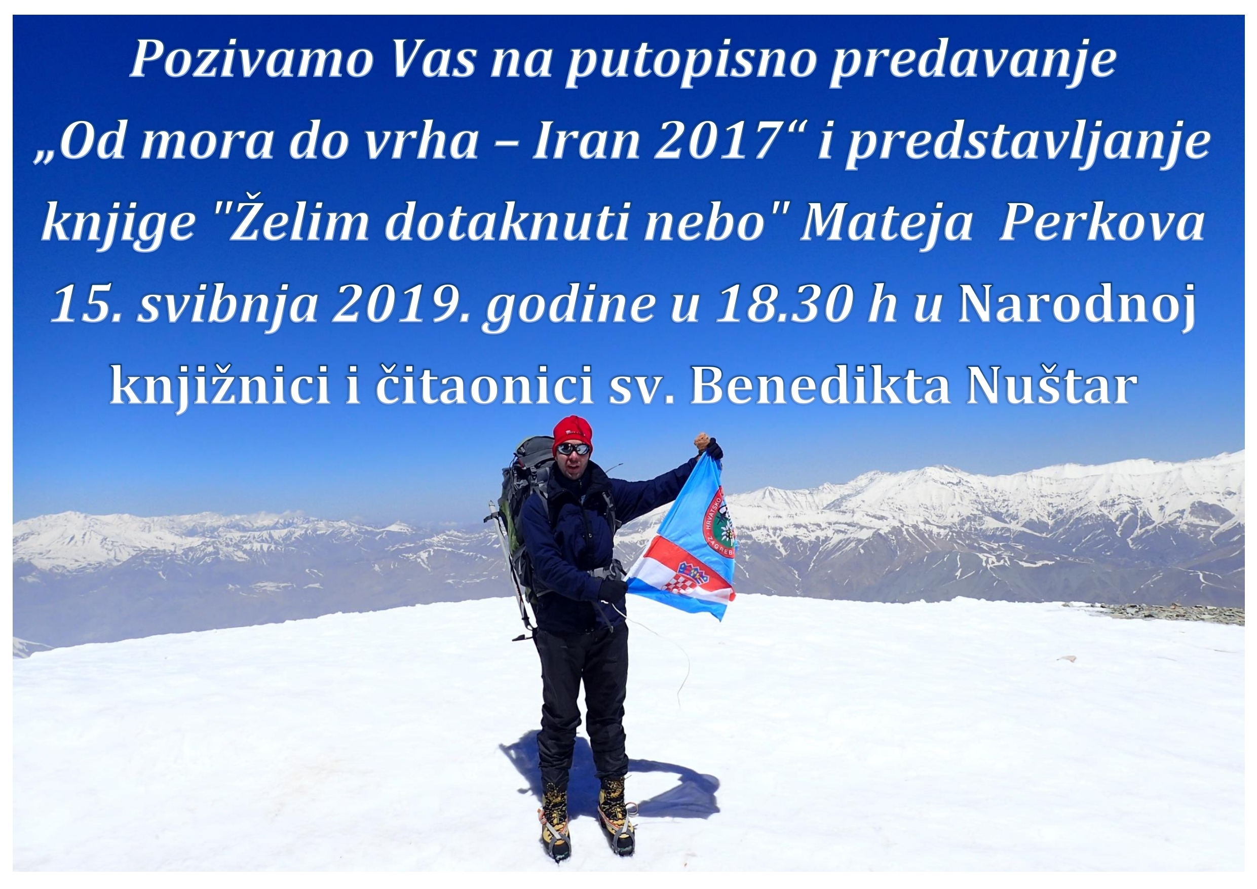 Gradska knjižnica i čitaonica Vinkovci vas poziva na putopisno predavanje "Od mora do vrha - Iran 2017" i predstavljanje knjige "Želim dotaknuti nebo" Mateja Perkova koji će se odviti u srijedu, 15. svibnja 2019. godine u 18:30 sati u Narodnoj knjižnici i čitaonici sv. Benedikta Nuštar.