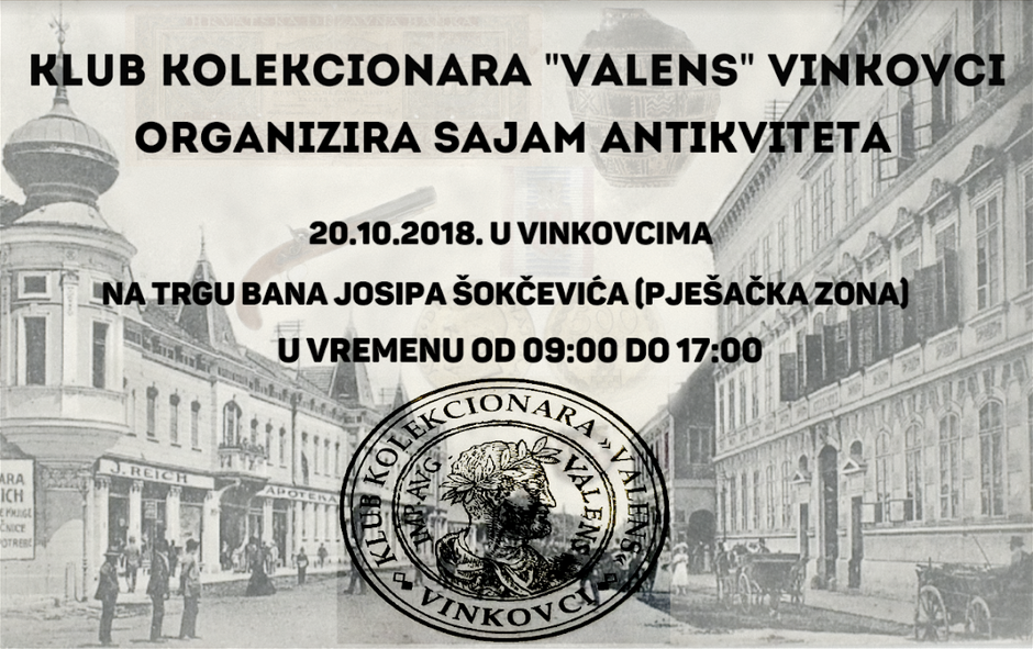 Klub kolekcionara "Valens", Vinkovci organizira "Sajam antikviteta" u subotu, 20. listopada 2018. god. na Trgu bana Josipa Šokčevića (pješačka zona) u Vinkovcima. Sajam možete posjetiti od 9 do 17 sati.