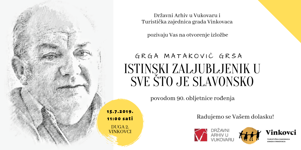 Državni arhiv u Vuovaru i TZ grada Vinkovaca pozivaju Vas na otvorenje izložbe povodom devedesetoga rođendana Grge Matakovića, dugogodišnjega tajnika Turističkoga društva Vinkovci.