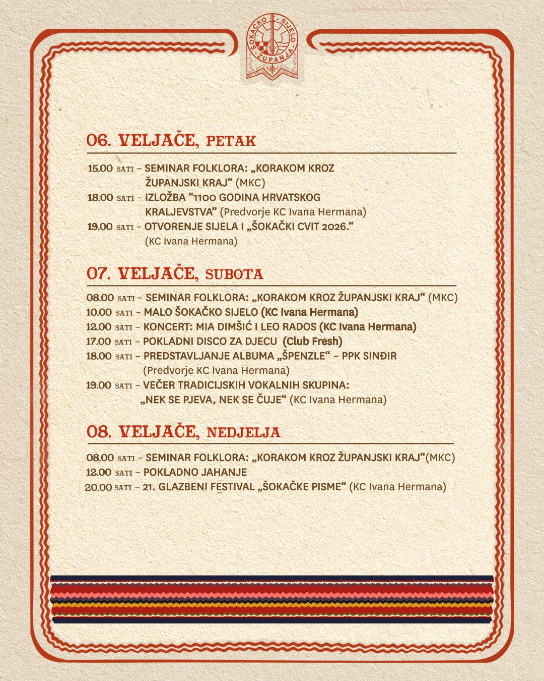 Program 59. Šokačkog sijela koje će se održati u Županji od 06.02. do 17. 02. 2026., možete pogledati u nastavku u galeriji fotografija, ili preuzeti na sljedećoj poveznici: > Program 59. Šokačkog sijela (.zip).