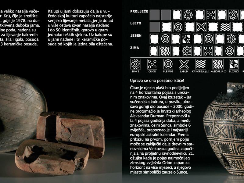 Grad Vinkovci izgradio je pješačku zonu u kojoj je u parteru, u granitu, prikazan najstariji Europski kalendar/posuda koja datira od 2700. g. pr. Kr. posudu/kalendar pronašao je prof. Aleksandar Durman prilikom izvođenja arheoloških radova za izgradnju hotela Slavonije u Dugoj ulici 3 u Vinkovcima 1978. godine. Uz posudu/ kalendar pronađeni su u cijelosti sačuvani: kompletan pribor za lijevanje željeza, posude ljevača bakra, kalupi za serijsku proizvodnju oružja – sjekira, peći. Svi nalazi datiraju iz 2900. do 2400. g. pr.Kr.