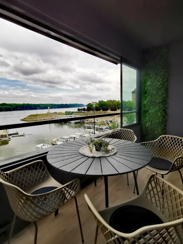 Najveća prednost apartmana je predivan, veliki balkon na kojem se može uživati u pogledu na zimsku luku, šetnicu i Dunav te crkvu sv. Filipa i Jakova i Vodotoranj.