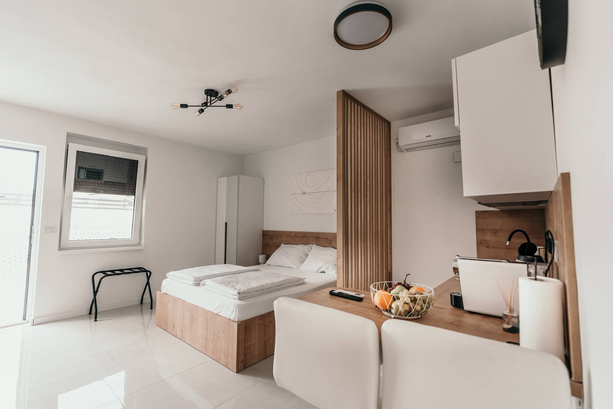 Svaka smještajna jedinica opremljena je udobnim bračnim krevetom, potpuno opremljenom kuhinjom i vlastitom kupaonicom – sve što vam je potrebno za bezbrižan boravak.