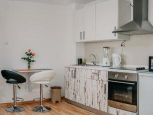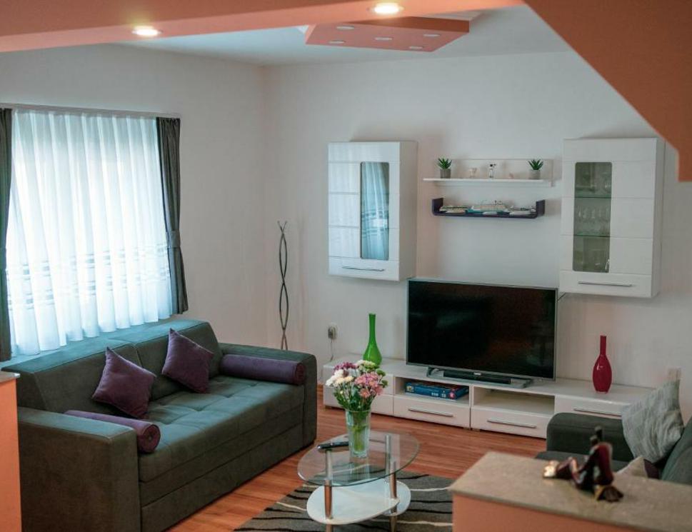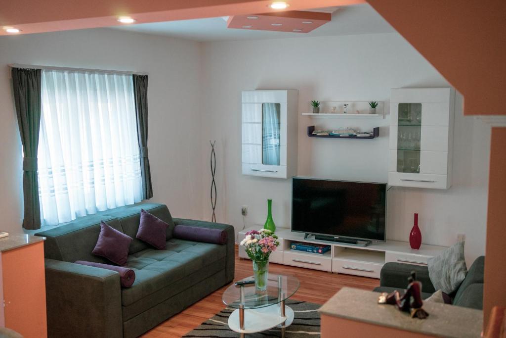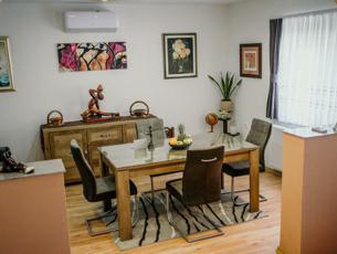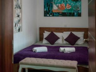 Klimatizirani apartman sastoji se od 1 spavaće sobe, dnevnog boravka, potpuno opremljene kuhinje te kupaonice.