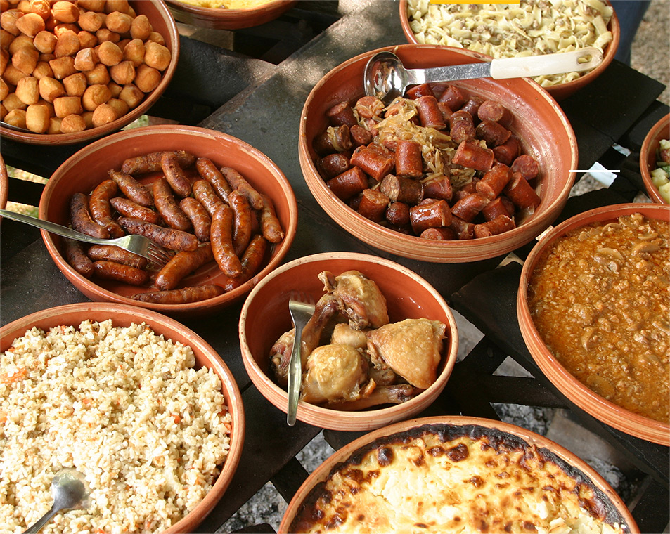 • glavna jela: domaća kobasica s dinstanim kiselim kupusom i pire krumpirom, čobanac, fiš, perkelt od riječne ribe s palentom i kajmakom