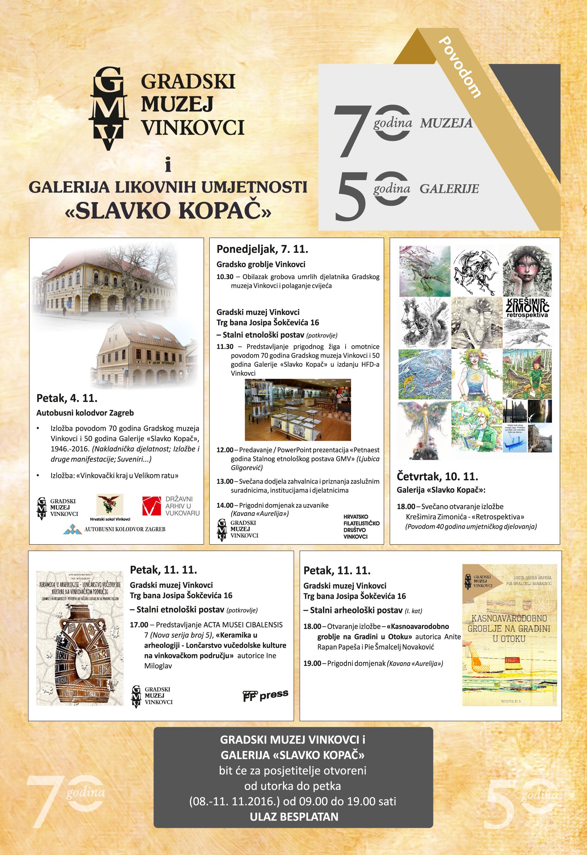 U organizaciji Gradskog muzeja Vinkovci i Hrvatskog filatelističkog društva, 7. studenog, u Gradskom muzeju Vinkovci (stalni etnološki postav), možete prisustovati obljetnici 70 godina Gradskog muzeja Vinkovci i 50 godina Galerije Slavko Kopač.
