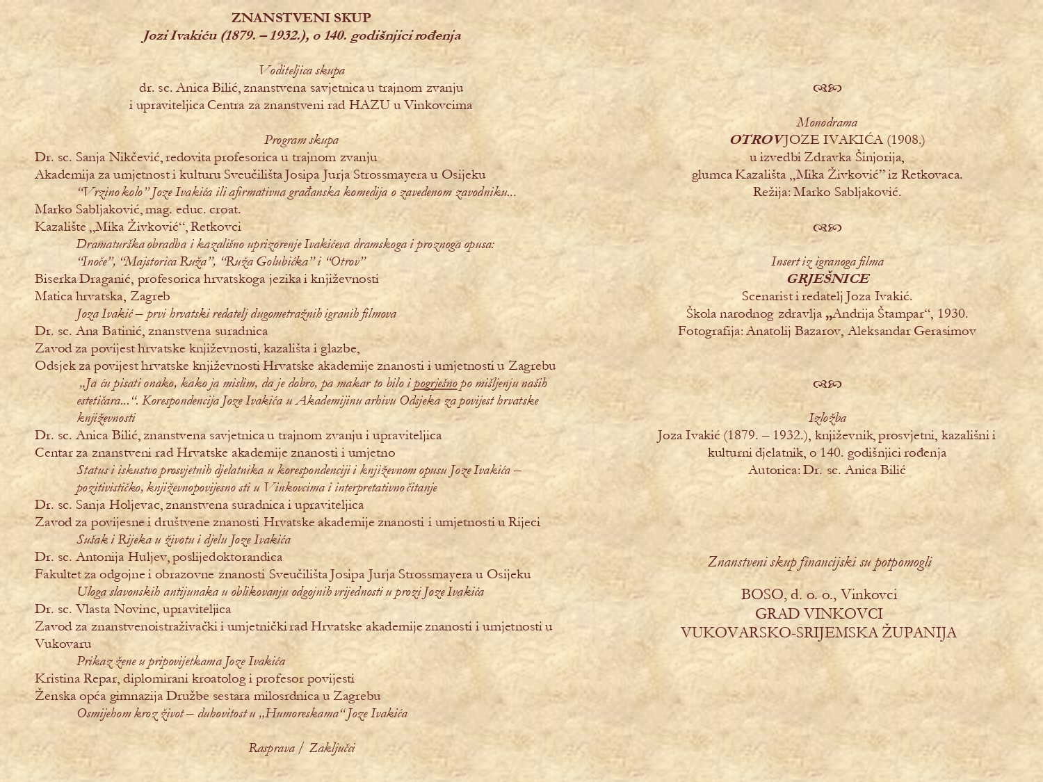 Hrvatska akademija znanosti i umjetnosti - Centar za znanstveni rad u Vinkovcima Vas poziva na književno-znanstvenu manifestaciju Knjiški Krnjaš V. - znanstveni skup Jozi Ivakiću o 140. godišnjici rođenja. Manifestacija se održava 16. studenog 2019. u 12 sati u Rodnoj kući Ivana Kozarca.
