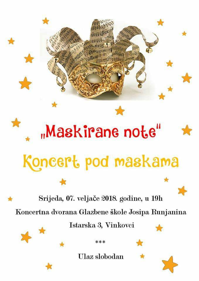 Glazbena škola J. Runjanina Vinkovci organizira koncert pod maskama "Maskirane note" 7. veljače 2018. godine, s početko u 19 sati. Kocert je za sve posjetitelje besplatan, a održava se u prostorijama škole (Istarska 3).
