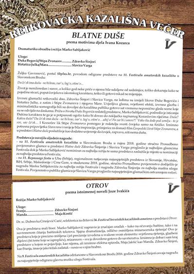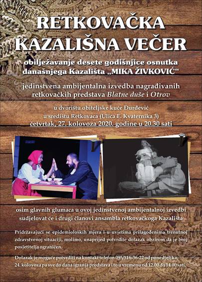 U četvrtak, 27. kolovoza 2020. godine u 20.30 sati u prekrasnom ambijentu dvorišta obiteljske šokačke kuće Đurđević (Ulica E. Kvaternika 3, u samome središtu Retkovaca) doživjet ćete jedinstvenu AMBIJENTALNU izvedbu već nagrađivanih retkovačkih predstava slavonske tematike BLATNE DUŠE i OTROV.