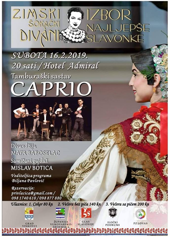 Izdavačka kuća Privlačica Vinkovci organizira "Zimske šokačke divane - Izbor najljepše Slavonke" u hotelu Admiral 16. veljače 2019. god s početkom u 20 sati. Tijekom večeri će vas zabavljati TS "Caprio".