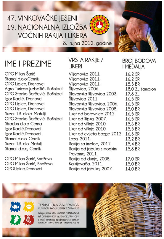 Ocjenjivanje je pod predsjedanjem dr. sc. Pavice Tupajić održano 8. rujna 2012. u Maloj vijećnici Vukovarsko-srijemske županije. Iako ova godina bilježi najmanji broj pristiglih uzoraka u 19 godina održavanja izložbe, Izložba je ponudila neke zanimljive uzorke kao i nove proizvođače. Ocjenjivačko povjerenstvo u sastavu: Vesna Jurak, Vera Zima, Tatjana Vuković, Miroslav Banić i Miroslav Ivanković ocijenilo je svih 26 pristiglih uzoraka, od čega je bilo 20 uzoraka rakija i šest uzoraka likera. Ove godine na Izložbu je pristiglo 9 različitih vrsta rakija i 5 vrsta likera. Do sada najzastupljeniji proizvod Izložbe, šljivovica, bio je zastupljen sa 6 uzoraka, svi s područja Vukovarsko – srijemske županije. No, šljivovica je i ovaj puta potvrdila svoj značaj i kvalitetu, pa je upravo uzorak šljivovice iz 2006. godine, proizvođača Darka Juzbašića iz Bošnjaka nagrađen oznakom šampiona izložbe s najvećim brojem osvojenih bodova na Izložbi, 18,0. Zlatnom je medaljom nagrađena i slavonska šljivovica OPG-a Stanko Šarčević iz Bošnjaka. Srebrnom medaljom na izložbi je nagrađeno ukupno 8 uzoraka, 5 rakija i 3 likera, dok je brončanom medaljom nagrađeno deset uzoraka, 8 rakija i 2 likera. Ukupno je sudjelovalo 12 proizvođača iz 7 Županija.Ocjenjivali su okus, miris, boju i bistroću, a najveći mogući broj bodova je 20. Temeljem dobivenih bodova određuje se nagrađivanje s jednom od tri medalje. Da bi neka rakija ili liker dobili zlatno odličje moraju biti ocijenjeni s između 17,5 i 20 bodova. Ovogodišnje ocjenjivanje označilo je šest uzoraka kao neocijenjene ili eliminirane. Posebno treba skrenuti pozornost na stroge kriterije ocjenjivanja, pa tako uzorci koji imaju nejasne ili neodgovarajuće podatke na etiketi bivaju neocijenjeni. Ukoliko stručno povjerenstvo ocijeni vašu rakiju zlatnom, srebrnom, ili brončanom medaljom primate neospornu potvrdu kvalitete i veliko priznanje, a time i veće šanse za što bolji plasman proizvoda.