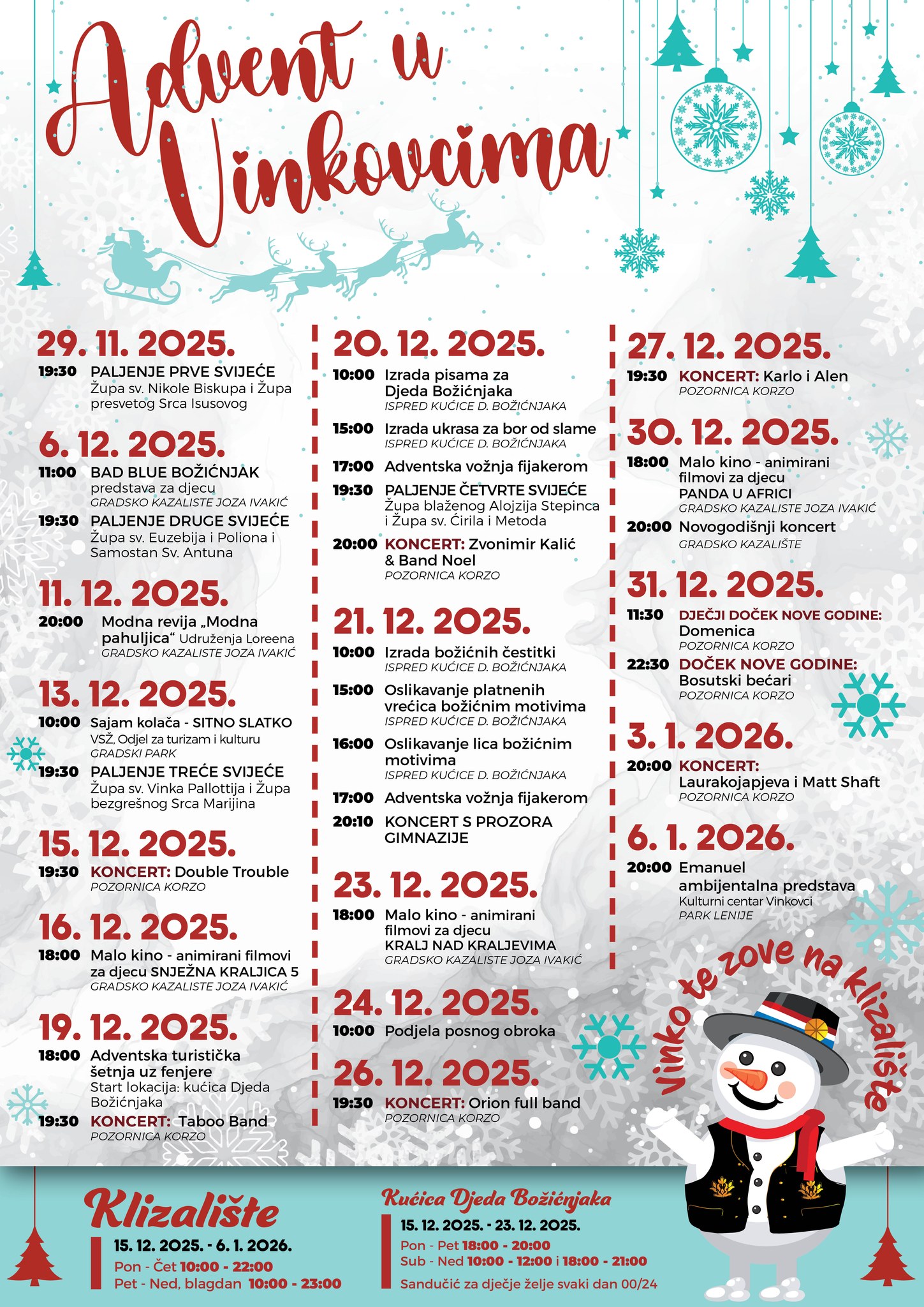 Donosimo vam program prepun koncerata, zimskih radosti, kreativnih radionica i obiteljskih trenutaka uz klizalište i Kućicu Djeda Božićnjaka.