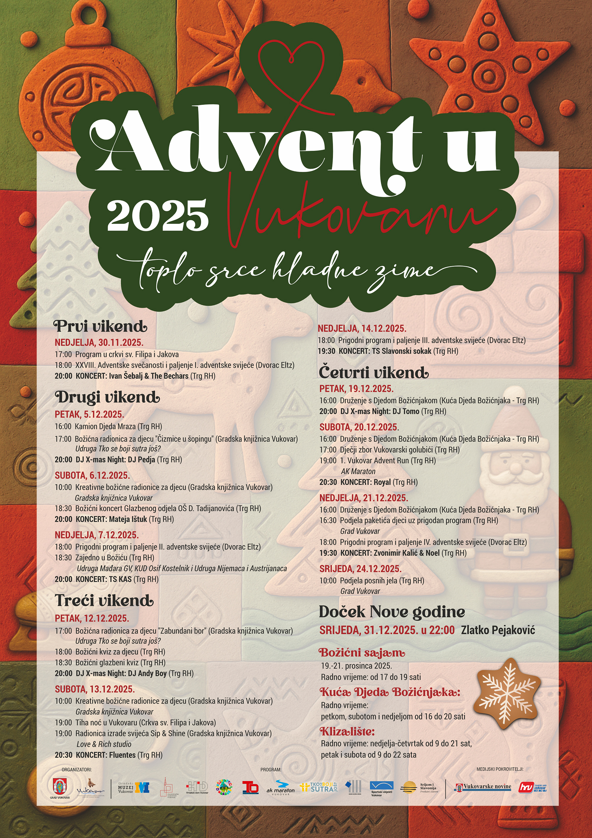 Vukovarski adventski program koji će se na glavnom gradskom trgu održati vikendima od 30. studenog do 21. prosinca 2025. godine naglasak stavlja na obiteljsko druženje, toplinu ljudskog kontakta i stvaranje uspomena koje ostaju. Najmlađi će uživati u raznim kreativnim radionicama, prigodnim predstavama i druženjima s likovima iz blagdanskih priča. Posebnu radost donosi omiljeno klizalište na otvorenom – naša Ledena bajka već je tradicionalno mjesto gdje se smijeh i glazba stapaju s čarolijom svjetlucavih lampica.