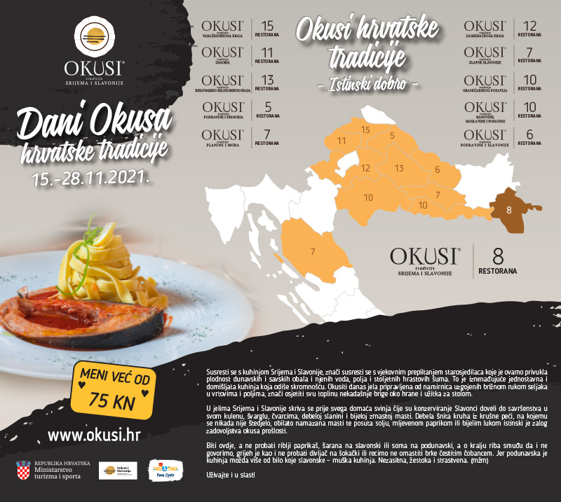 Čak trinaest dana pravog hedonizma i to po nikad povoljnijim cijenama čeka posjetitelje više od stotinu restorana diljem Lijepe Naše. Naime, od 15. do 28. studenog 2021. godine održavaju se Dani Okusa hrvatske tradicije, zajednička manifestacija nositelja standarda Okusi hrvatske tradicije, među kojima je i osam restorana iz Vukovarsko – srijemske županije.