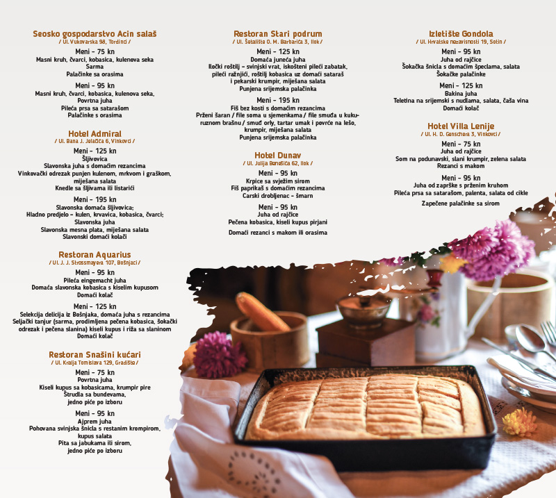 Acin salaš u Tordincima, hotel Admiral u Vinkovcima, bistro pizzerija Aquarius u Bošnjacima, hotel Villa Lenije u Vinkovcima, Stari podrum u Iloku, hotel Dunav u Iloku, Snašini kućari u Gradištu te izletište Gondola u Sotinu – mjesta su gdje caruju okusi tradicije.