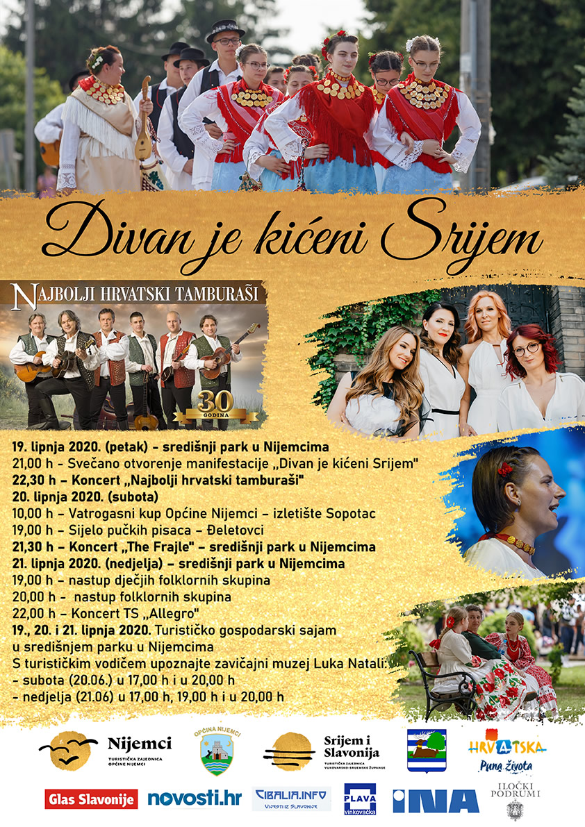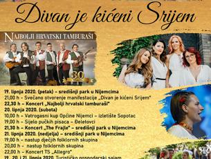 "Divan je kićeni Srijem" ove će se godine održati od 19. do 21. lipnja, a osim u Nijemcima, dio programa manifestacije održat će se u Đeletovcima i na izletištu Sopotac. 19. lipnja održat će se svečano otvorenje manifestacije u središnjem parku u Nijemcima nakon kojega će nastupiti Najbolji hrvatski tamburaši, 20. lipnja, također u središnjem parku u večernjim satima nastupit će The Frajle, a 21. lipnja zabavu će donijeti TS ,,Allegro''.