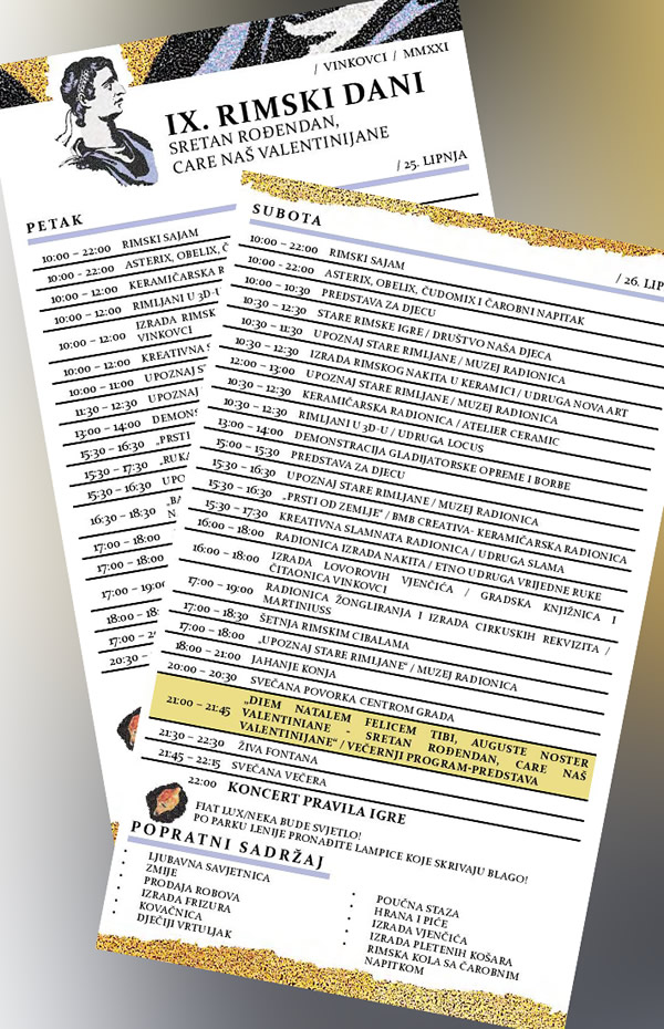 IX. Rimski dani u Vinkovcima, 25. i 26. lipnja pod nazivom „Sretan rođendan, care naš Valentinijane“. Iznimno bogat i raznolik svakodnevni program održava se u vremenu od 10.00 – 00.00. Pred nama su dva doista „rimska“ dana, ne propustite ih!