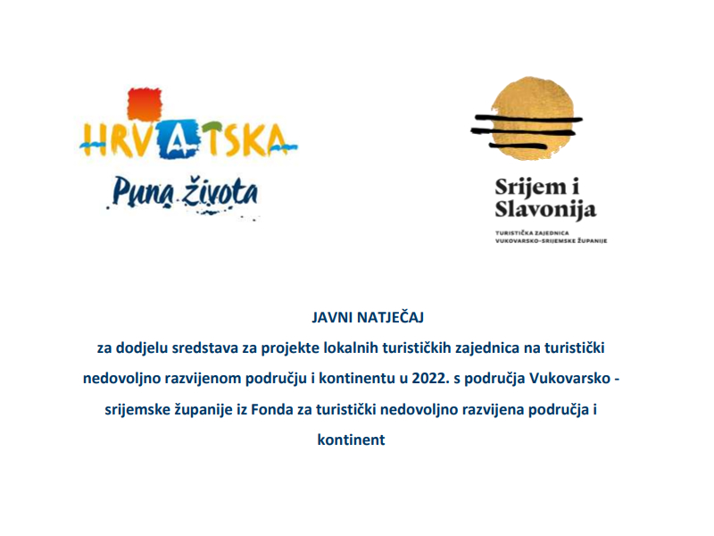 Turistička zajednica Vukovarsko – srijemske županije objavljuje JAVNI NATJEČAJ za dodjelu sredstava za projekte lokalnih turističkih zajednica na turistički nedovoljno razvijenom području i kontinentu u 2022. s područja Vukovarsko – srijemske županije iz Fonda za turistički nedovoljno razvijena područja i kontinent.