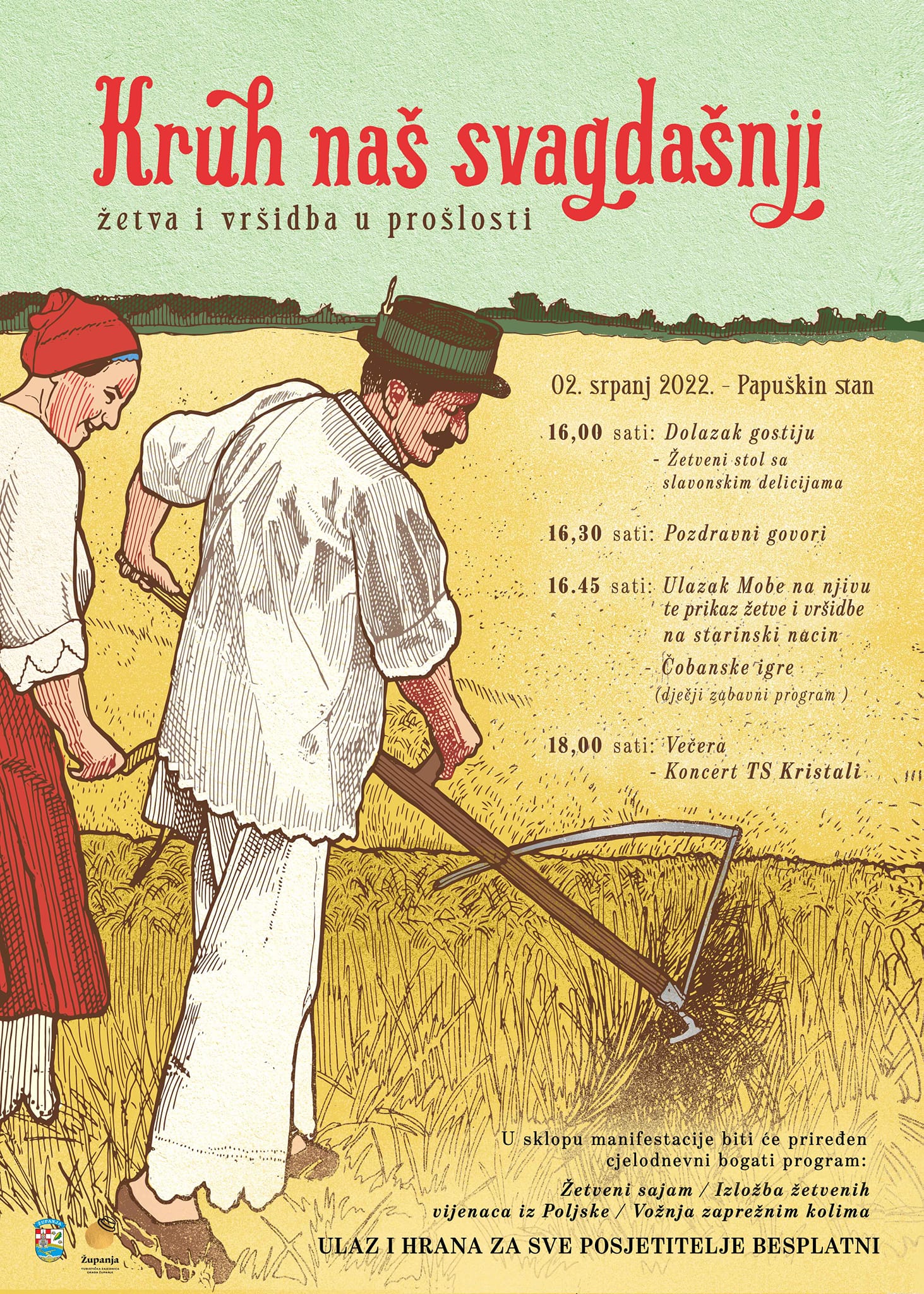 Pozivamo vas na kulturno-zabavnu manifestaciju “Kruh naš svagdašnji – žetva i vršidba u prošlosti” koja će se održati 2.srpnja (subota) 2022. godine na “Papuškinom stanu” u Županji s početkom u 16,00 sati.