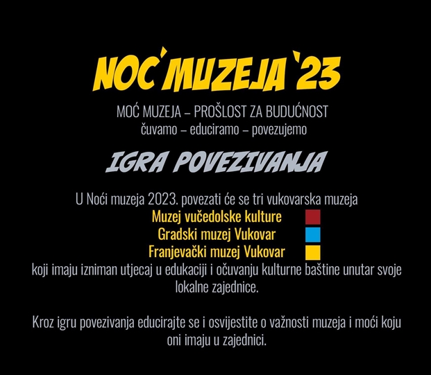 U Noći muzeja 2023. povezati će se tri vukovarska muzeja – Muzej vučedolske kulture, Gradski muzej Vukovar i Franjevački muzej Vukovar koji imaju izniman utjecaj u edukaciji i očuvanju kulturne baštine unutar svoje lokalne zajednice. Posjetitelji će se kroz igru povezivanja dodatno educirati i osvijestiti o važnosti muzeja i moći koju oni imaju u zajednici.