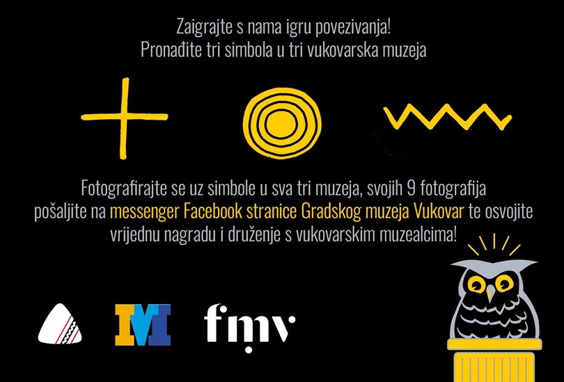 Pronađite ista motiva simbola s donjeg plakata u tri vukovarska muzeja i fotografirajte se uz simbole u sva tri muzeja - svojih 9 fotografija pošaljite na messenger Facebook stranice Gradskog muzeja Vukovar te osvojite vrijednu nagradu i druženje s vukovarskim muzealcima!