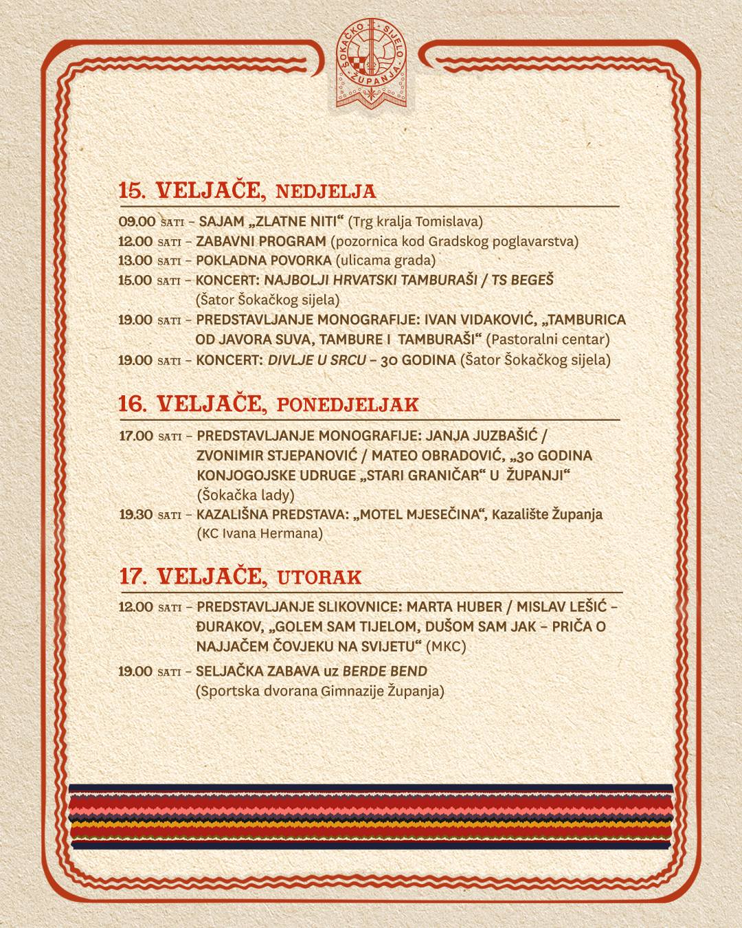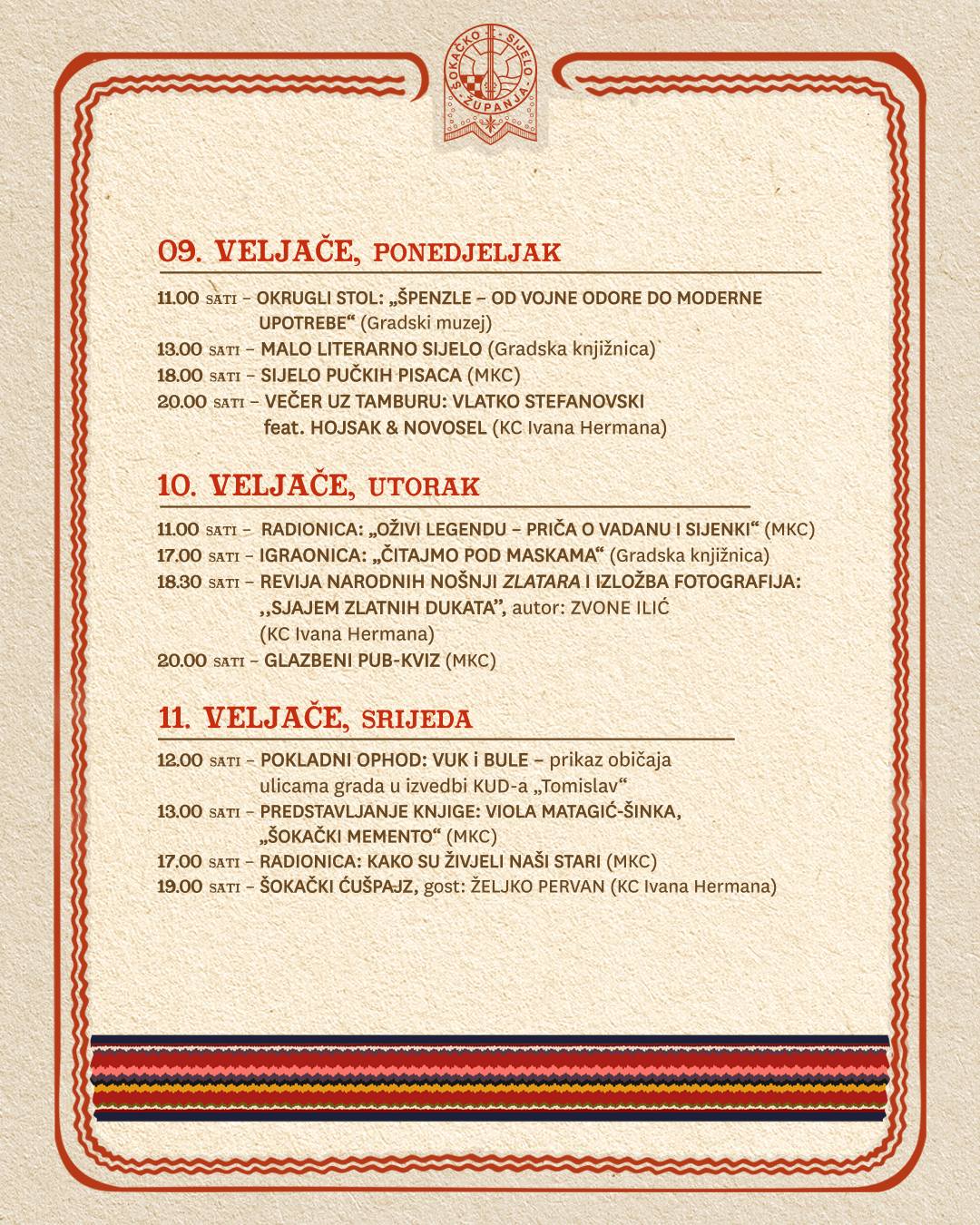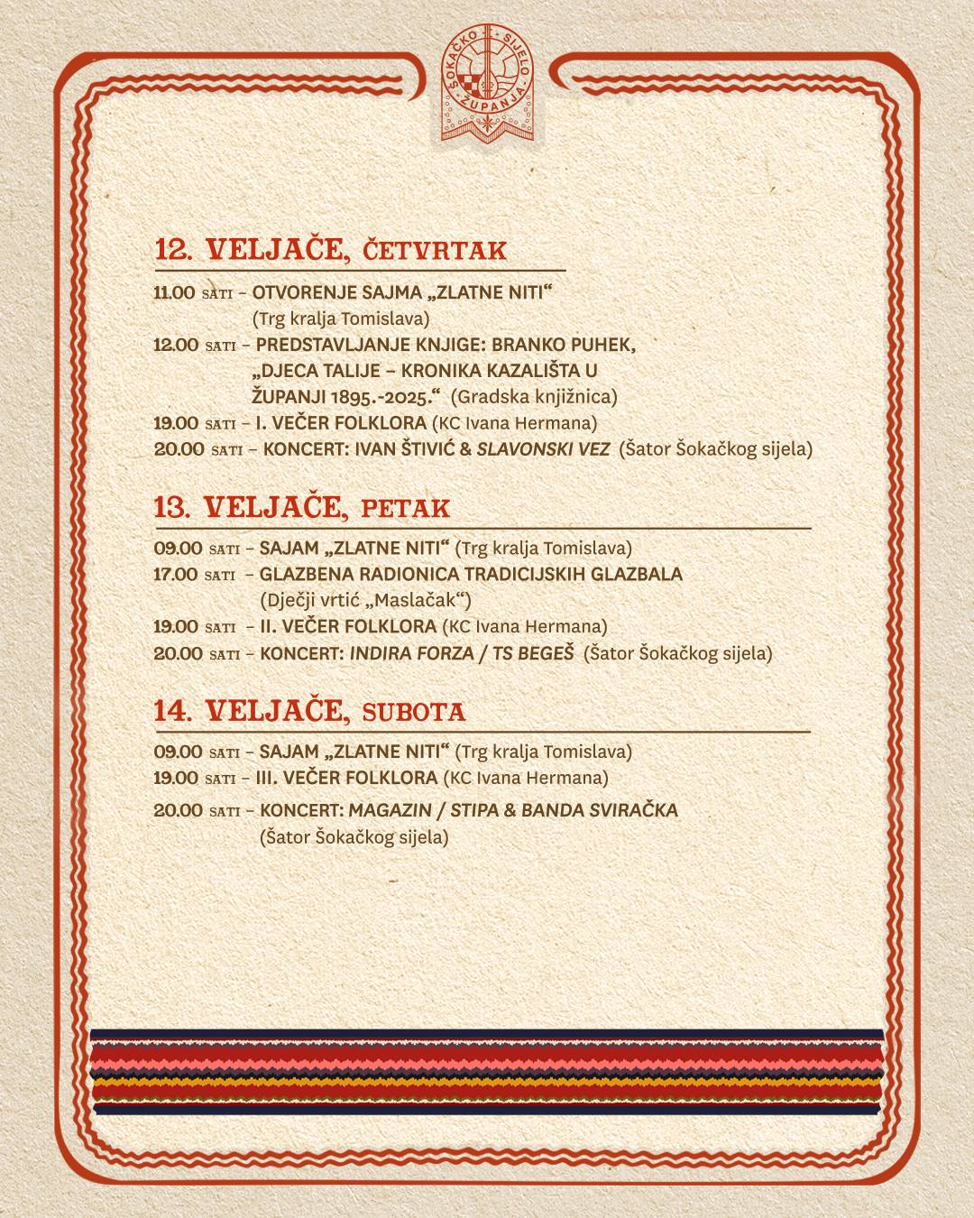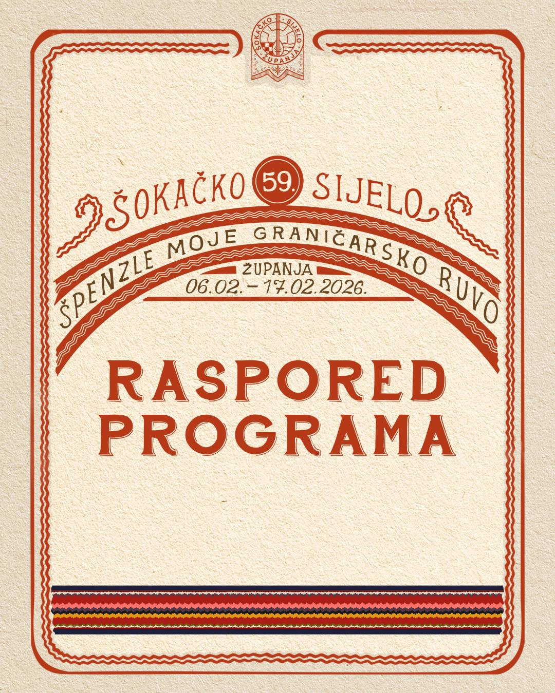 Program 59. Šokačkog sijela koje će se održati u Županji od 06.02. do 17. 02. 2026., možete pogledati u nastavku u galeriji fotografija, ili preuzeti na sljedećoj poveznici: > Program 59. Šokačkog sijela (.zip).