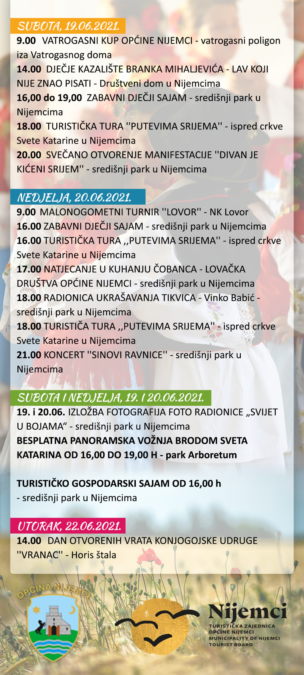 “Divan je kićeni Srijem” je središnja manifestacija koja povezuje  Hrvate Srijemce s obje strane granice. Manifestacija koja njeguje tradicijsku kulturu, folklorno naslijeđe i identitet zapadnog Srijema.