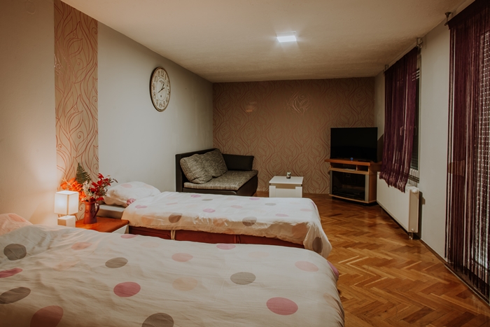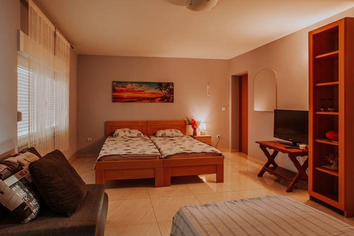 Smještajni kapacitet objekta sastoji se od apartmana na prvom katu, kojeg čine predprostor, dnevni boravak, kuhinja, kupaonica i soba s dva kreveta. Na drugom katu objekta nalazi se studio apartman koji se sastoji od prostorije za boravak i spavanje s priručnom kuhinjom i kupaonicom i jedna odvojena trokrevetna soba s televizorom i kupaonicom.
