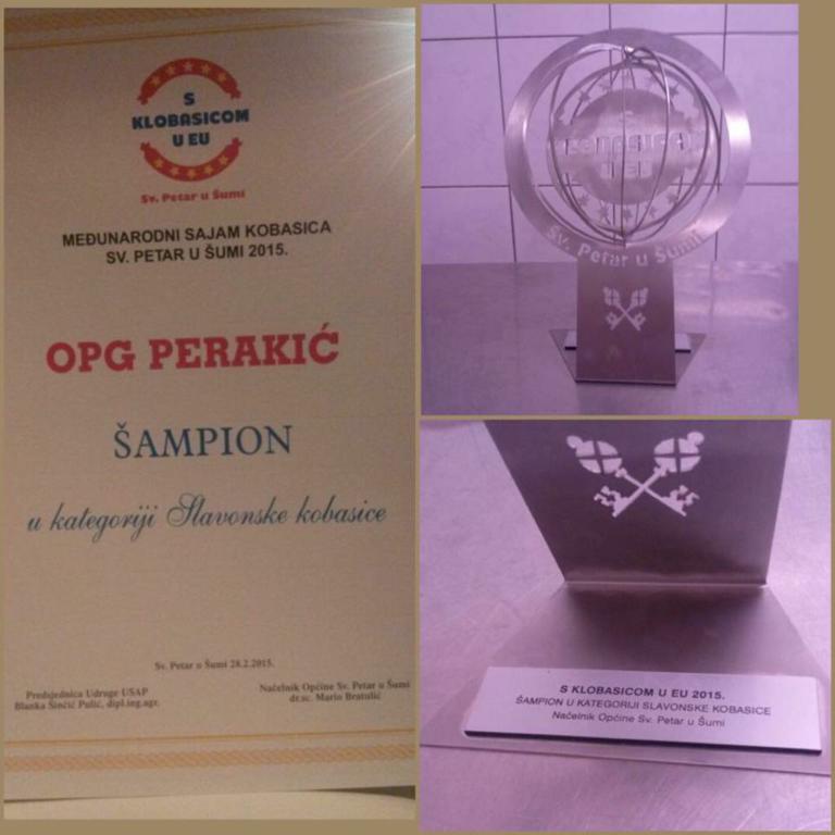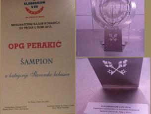 Za svoj rad obitelj je dobila podosta priznanja i struke i potrošača. Kulen koji proizvode više je puta bio nagrađivan na raznim manifestacijama proglašavan je šampionskim, dobio je zlatnu, srebrnu i brončanu medalju. I njihova je dimljena kobasica ponijela titulu šampionske na manifestaciji Kobasicom u Europi, održanoj u Istri. A na šunkijadi u Starim Mikanovcima šunka Perakićevih osvojila je zlato.