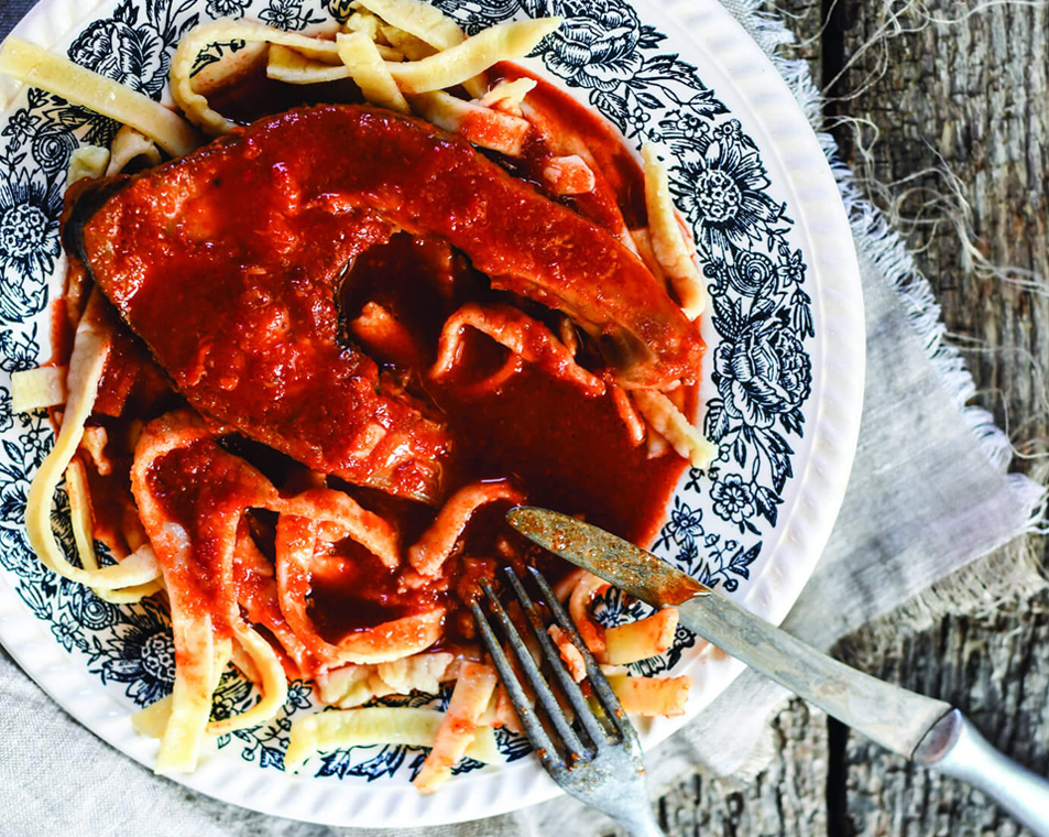 Servirajte sa domaćim širokim rezancima.